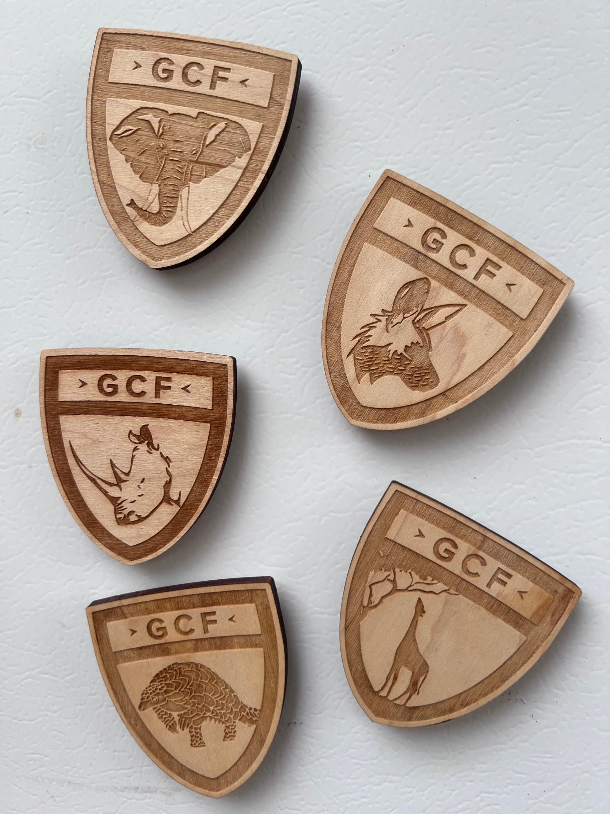 GCF Laser Etched Shields on Wood, 3”x 4”, with strong magnet back.