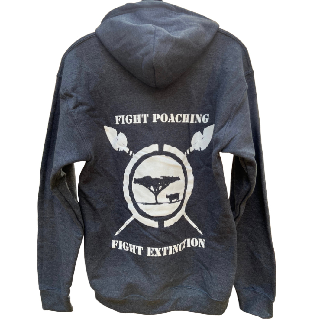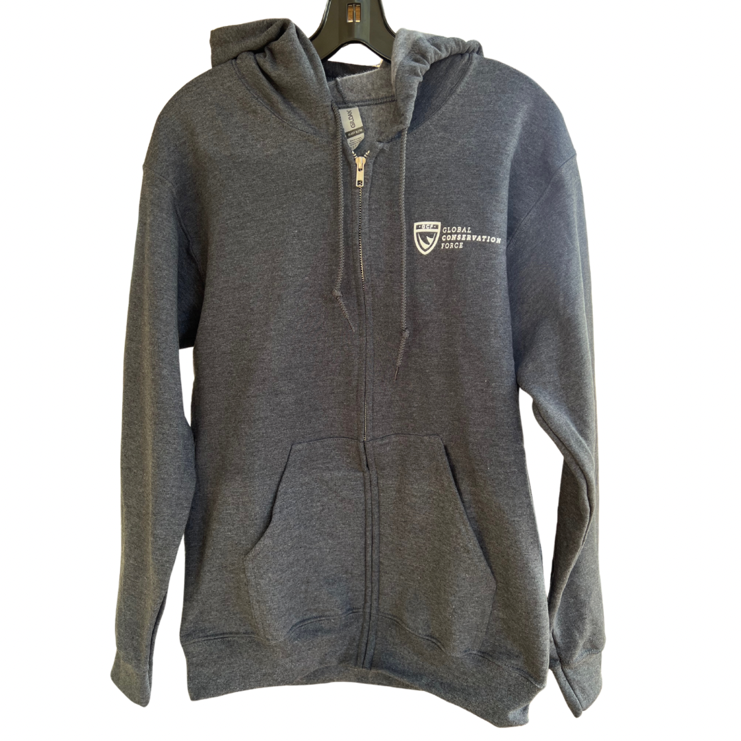 Dark heather gray, zip up jacket, with hood. Support frontline wildlife protection and conservation efforts with every purchase.