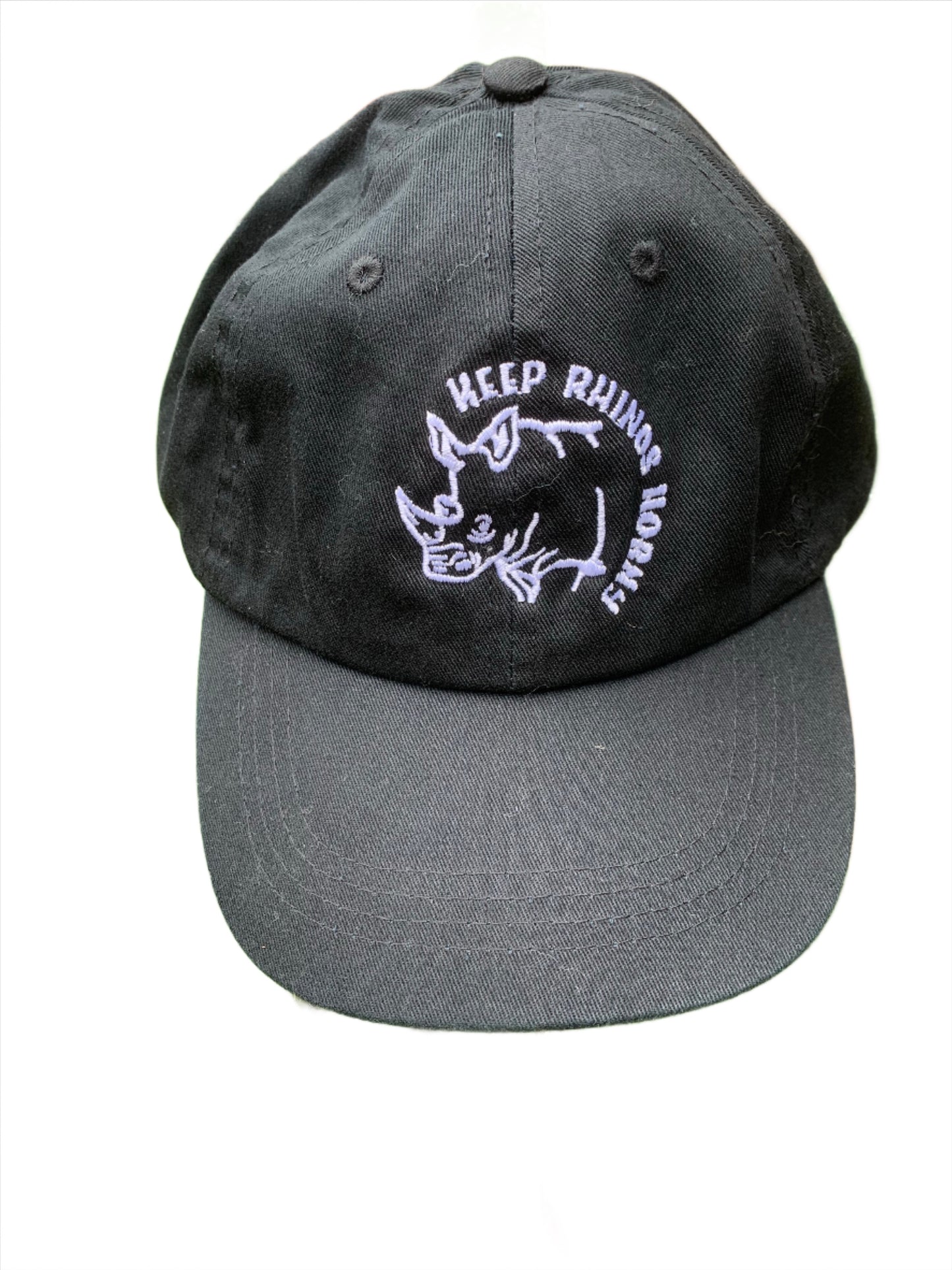 Black baseball hat with “Keep Rhinos Horny” logo in white. 100% cotton. Adjustable strap