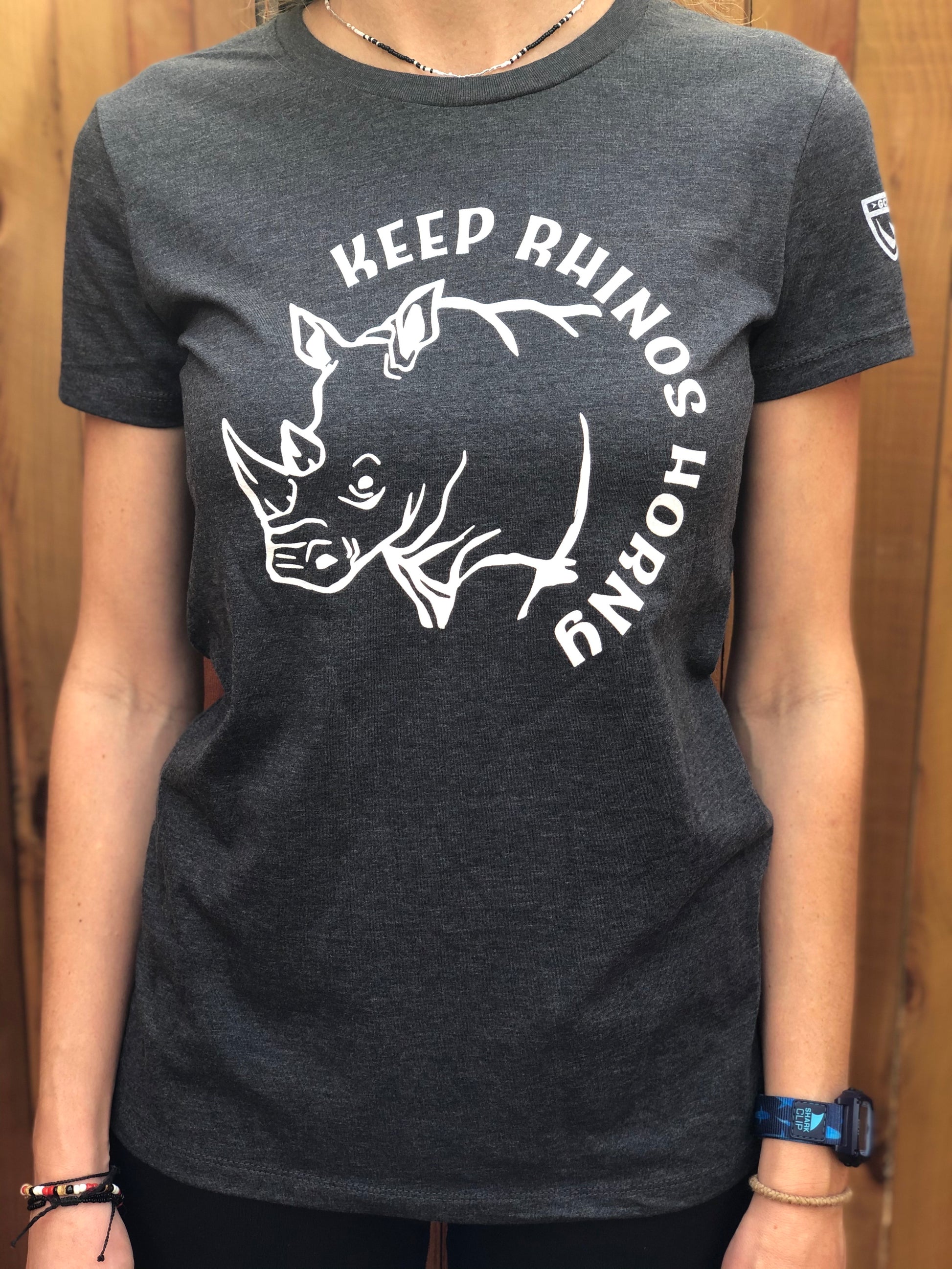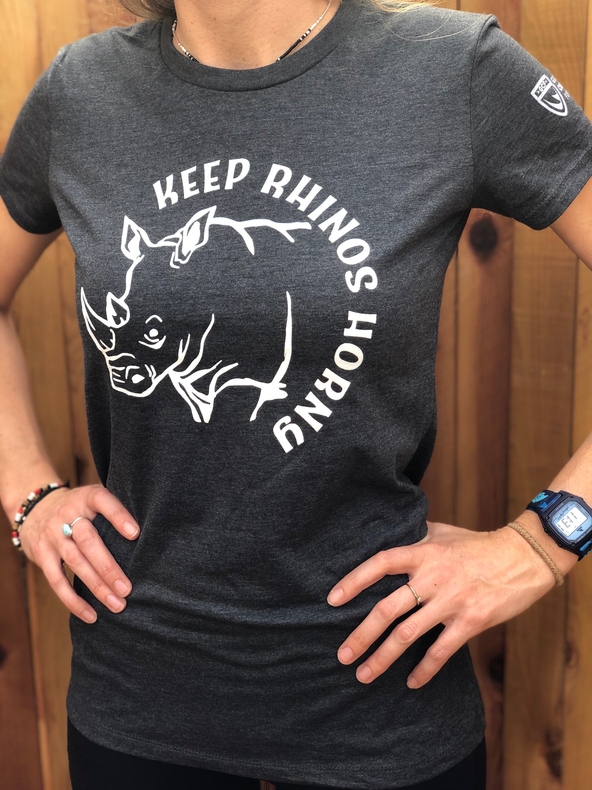 Help Keep Rhinos Horny with the purchase of our women’s shirt. All proceeds support our frontline wildlife protection and conservation efforts. Cotton, polyester, rayon blend, fits true to size.